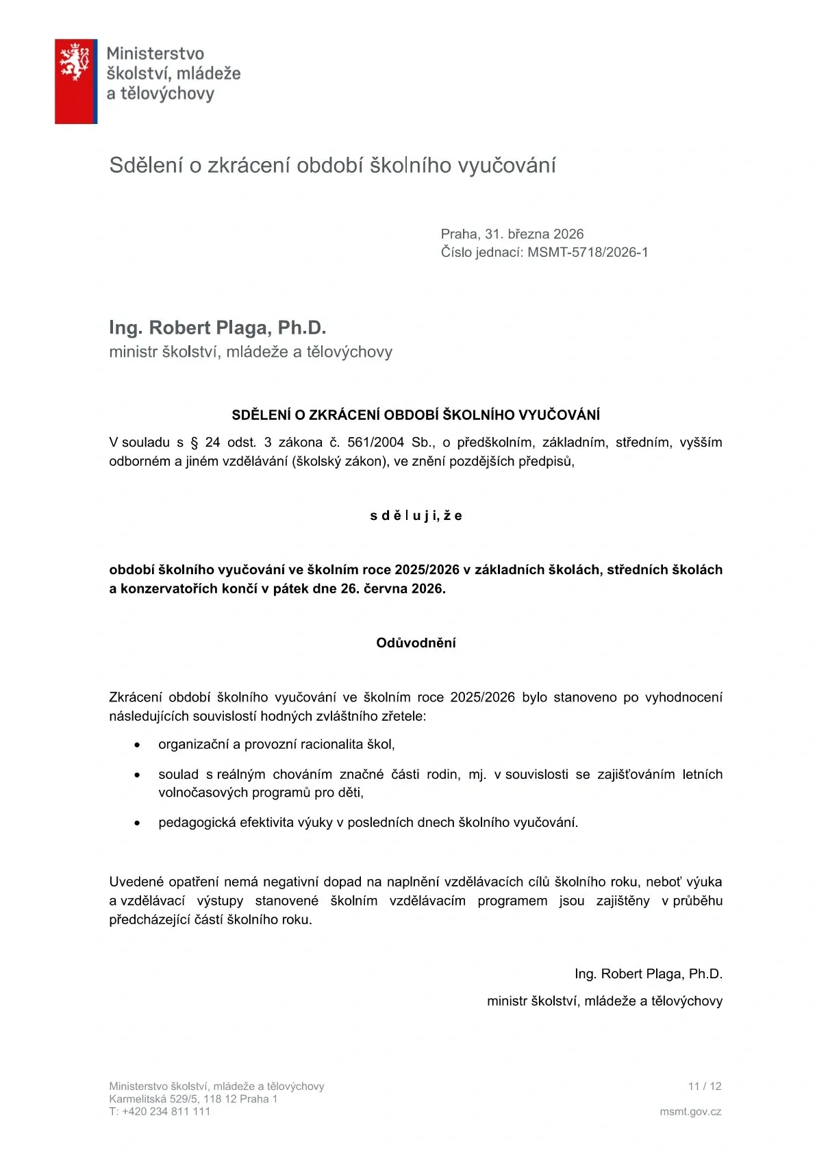 Nově bude školní vyučování ukončeno v pátek 26. června 2026.