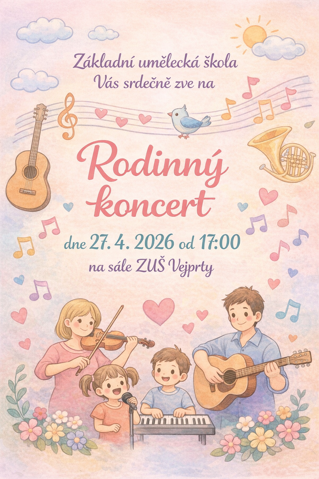 Základní umělecká škola Vejprty srdečně zve všechny žáky, rodiče, přátele i širokou veřejnost na druhý Rodinný koncert, který se uskuteční v pondělí 27. dubna 2026 od 17:00 hodin v sále ZUŠ Vejprty.